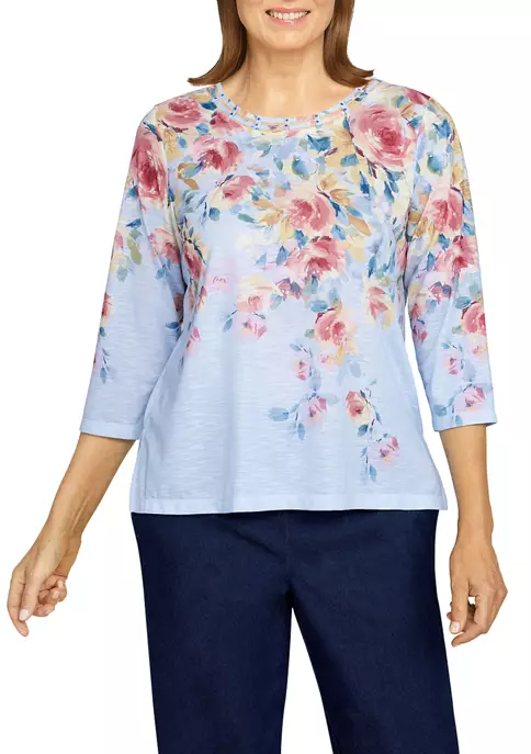 Best Sale 🎁 Alfred Dunner Petite Copper Canyon Asymmetrical Hem 3/4 Sleeve Floral Print Top 🎁