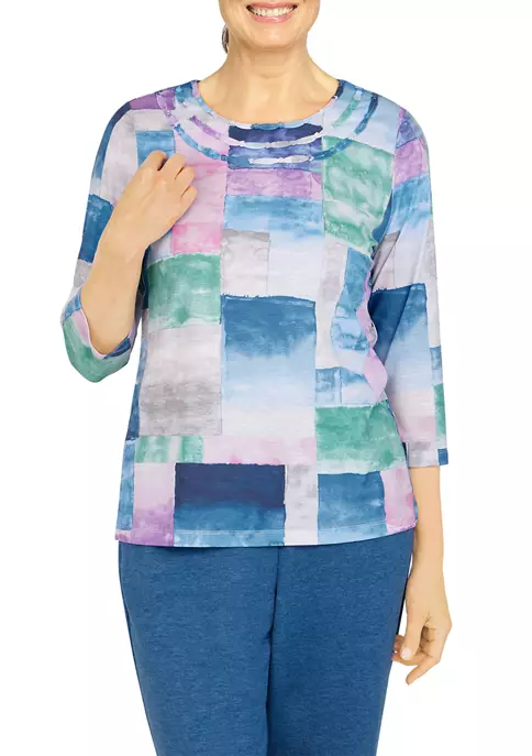 Best Sale π Alfred Dunner Petite Copper Canyon Asymmetrical Hem 3/4 Sleeve Floral Print Top π