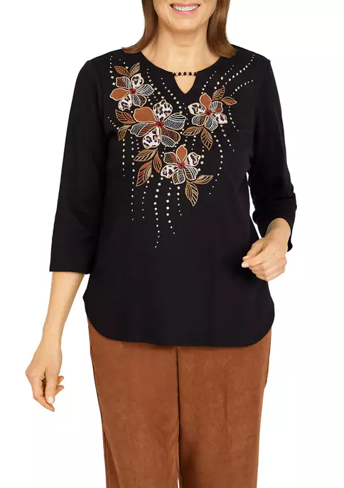Best Sale π Alfred Dunner Petite Copper Canyon Asymmetrical Hem 3/4 Sleeve Floral Print Top π